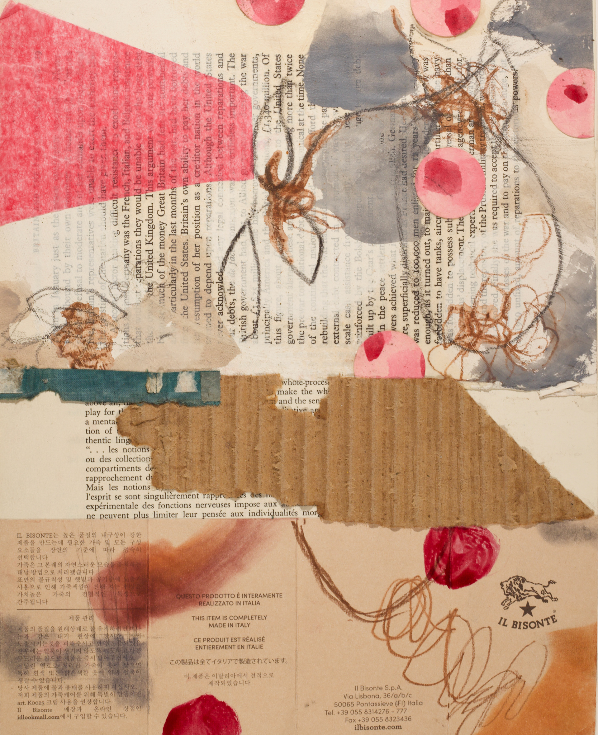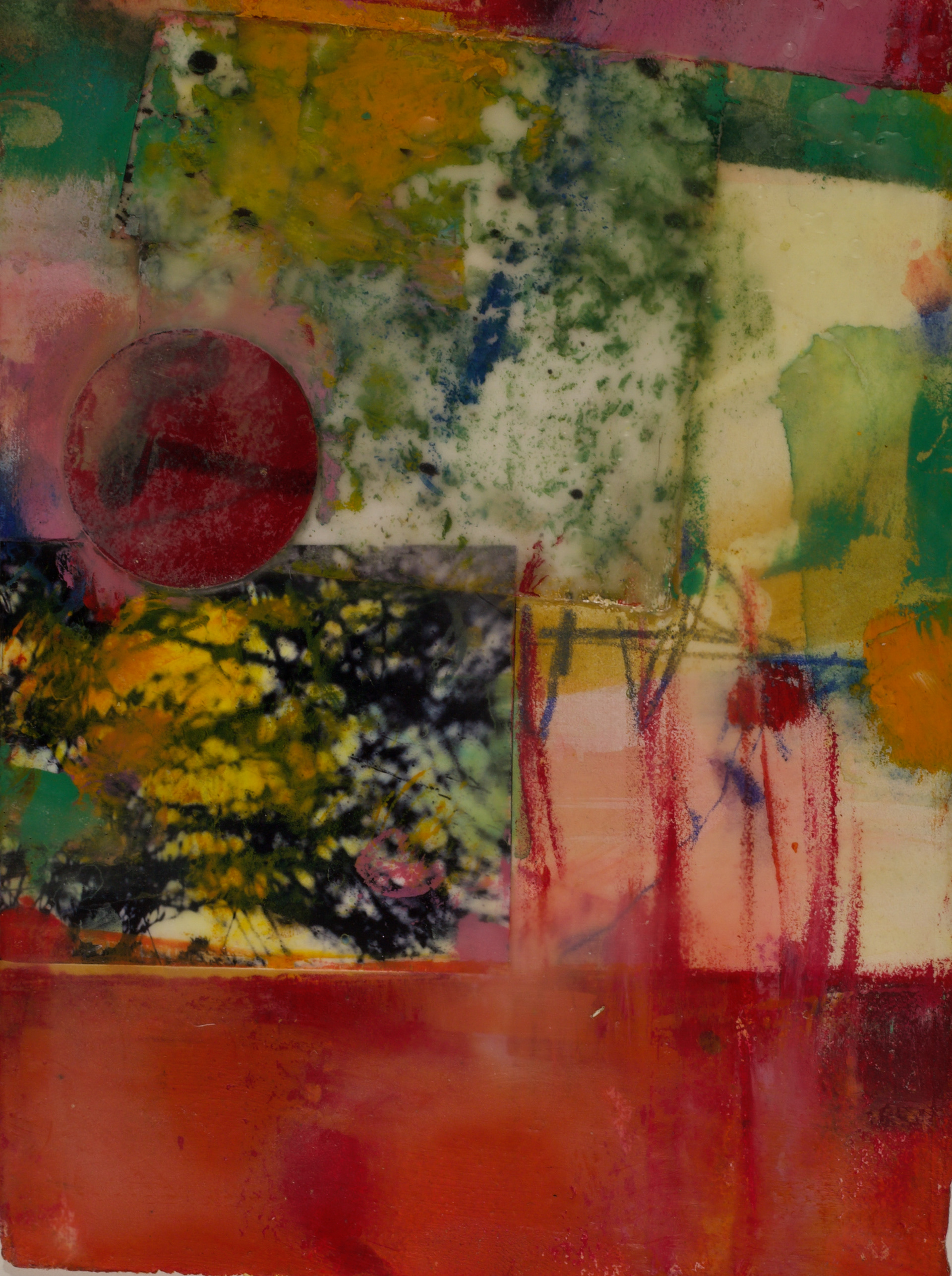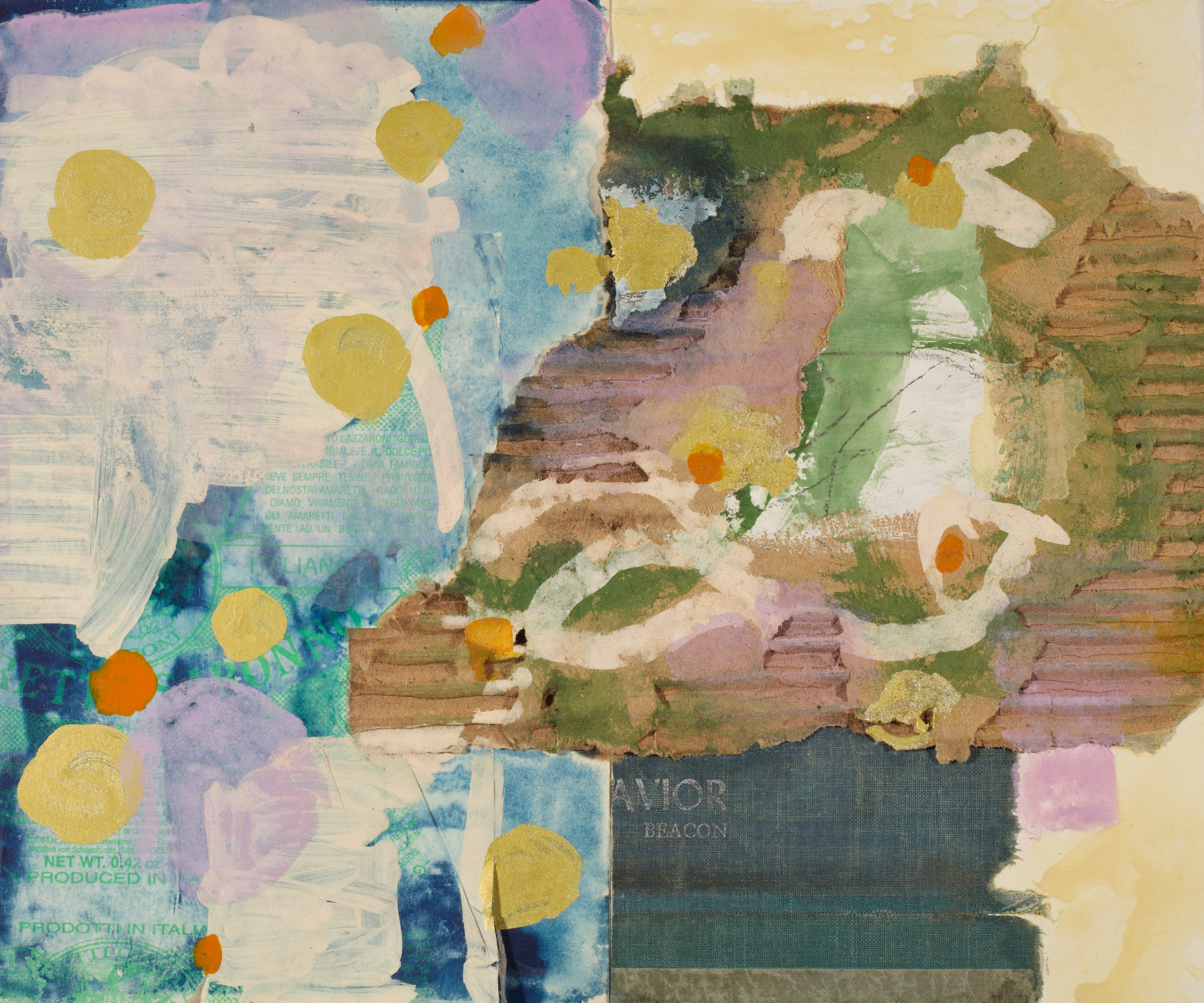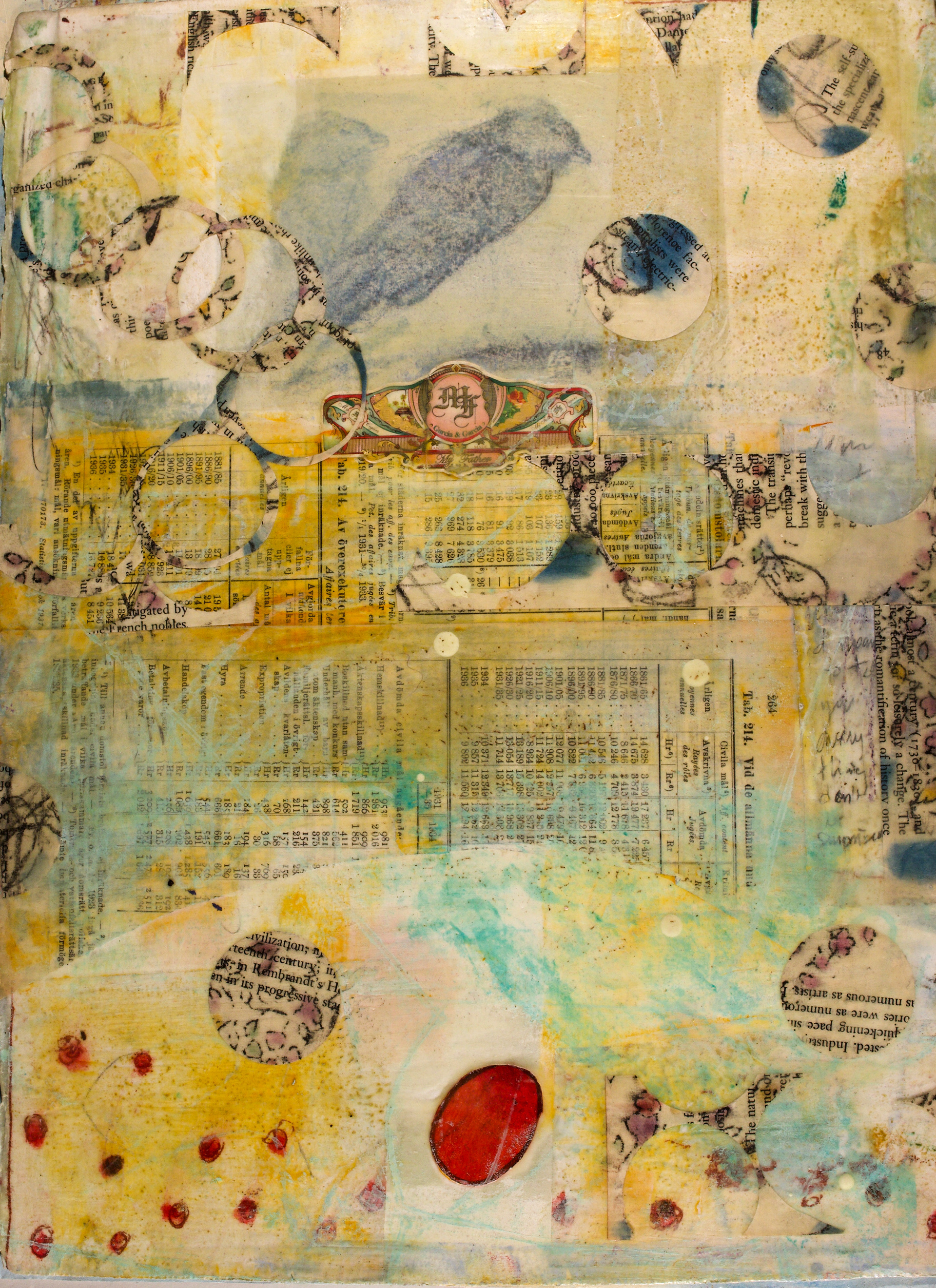 "Nest" Collage, Cold Wax and Pochoir. 30" x 40", 2019.